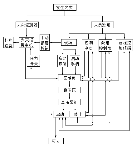 圖2是高壓細(xì)水霧滅火系統(tǒng)的工作原理圖:在監(jiān)視狀態(tài)下,高壓細(xì)水霧系統(tǒng)從泵組單向閥出口至分區(qū)控制閥前的管網(wǎng)內(nèi)(閉式至噴頭管網(wǎng))維持在1.0~1.2MPa。當(dāng)該管網(wǎng)內(nèi)壓力低于1.0MPa時,穩(wěn)壓泵啟動,使該管網(wǎng)內(nèi)的壓力達(dá)到1.2MPa,當(dāng)穩(wěn)壓泵運行超過10秒后壓力仍沒有達(dá)到1.2MPa,主泵啟動,穩(wěn)壓泵停止。主泵可分別通過火災(zāi)報警控制器、現(xiàn)場手動按鈕、現(xiàn)場機(jī)械應(yīng)急手柄、手動報警按鈕、控制中心、泵組控制盤、遠(yuǎn)程控制終端共七種方式間接啟動。
