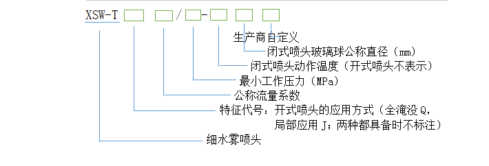 高壓細(xì)水霧噴頭型號由產(chǎn)品類別、產(chǎn)品代號、主參數(shù)、自定義代號等組成。